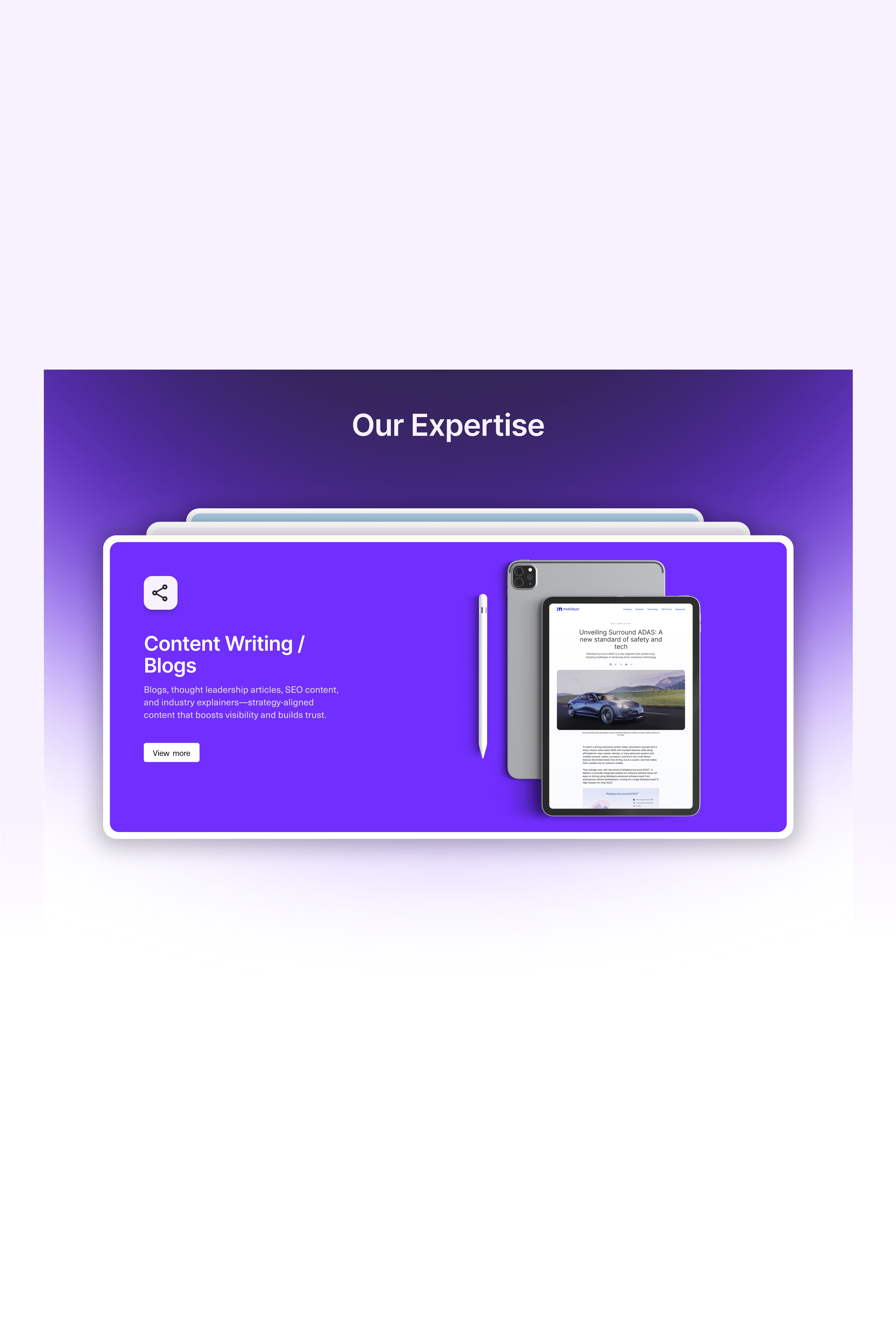 We delivered a website that unifies Writec’s marketing and technical writing services into a clear, professional brand story. A dynamic showreel on the home page now instantly communicates the company’s value, while the Works page – featuring 40 curated projects – highlights over 20 years of experience with top Israeli & global tech companies. The result is a site that tells their story with clarity and elevates their authority in the industry – leaving the client highly satisfied.